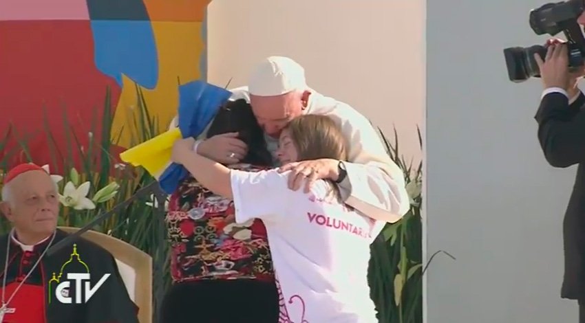 El Santo Padre llamó al estrado a dos jóvenes con síndrome de down. Ambas abrazaron fuertemente al Pontífice quien las besó, las bendijo y les obsequió un rosario a cada una.
